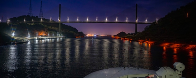 His Majesty’s Canadian Ship Max Bernays navigates through the Panama Canal at night during the ship’s coastal transfer to Canadian Forces Base Esquimalt on 24 March, 2024.