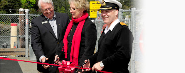 Victoria Harbour Ferries President Nick Samson, Esquimalt Mayor Barb Desjardins and Base Commander Capt(N) Craig Baines cut the ribbon to officially open the new Baseline Ferry service.